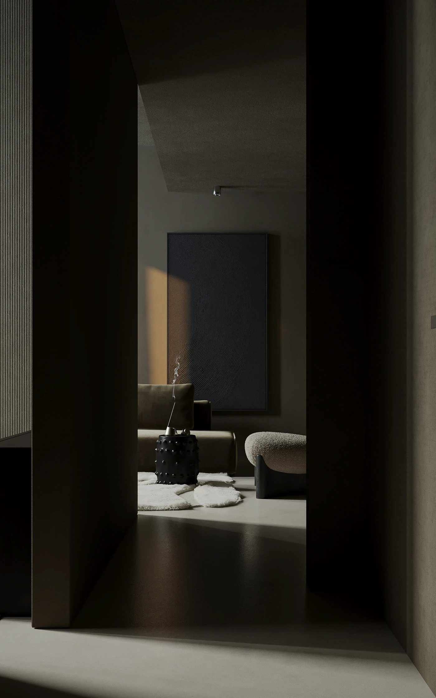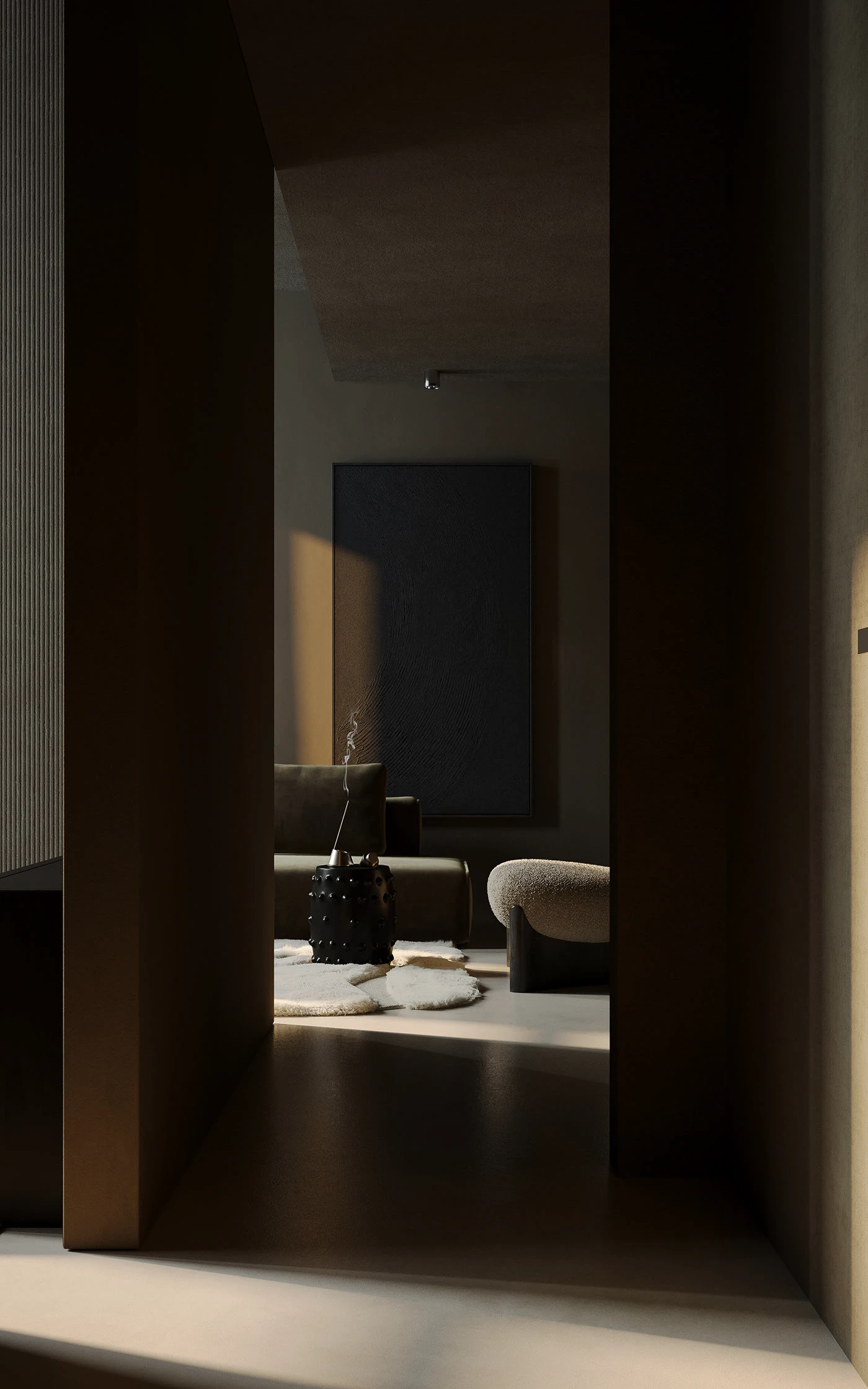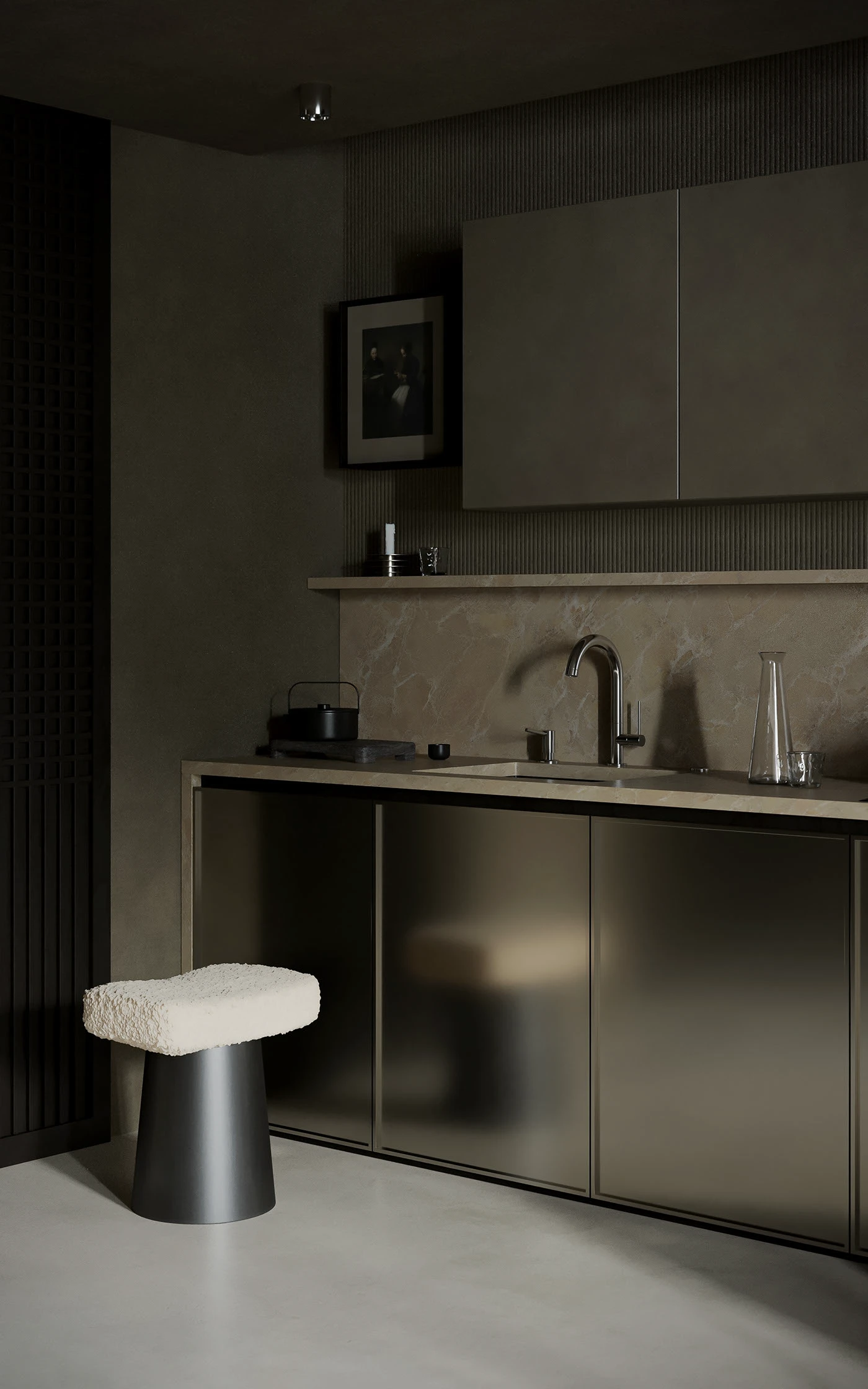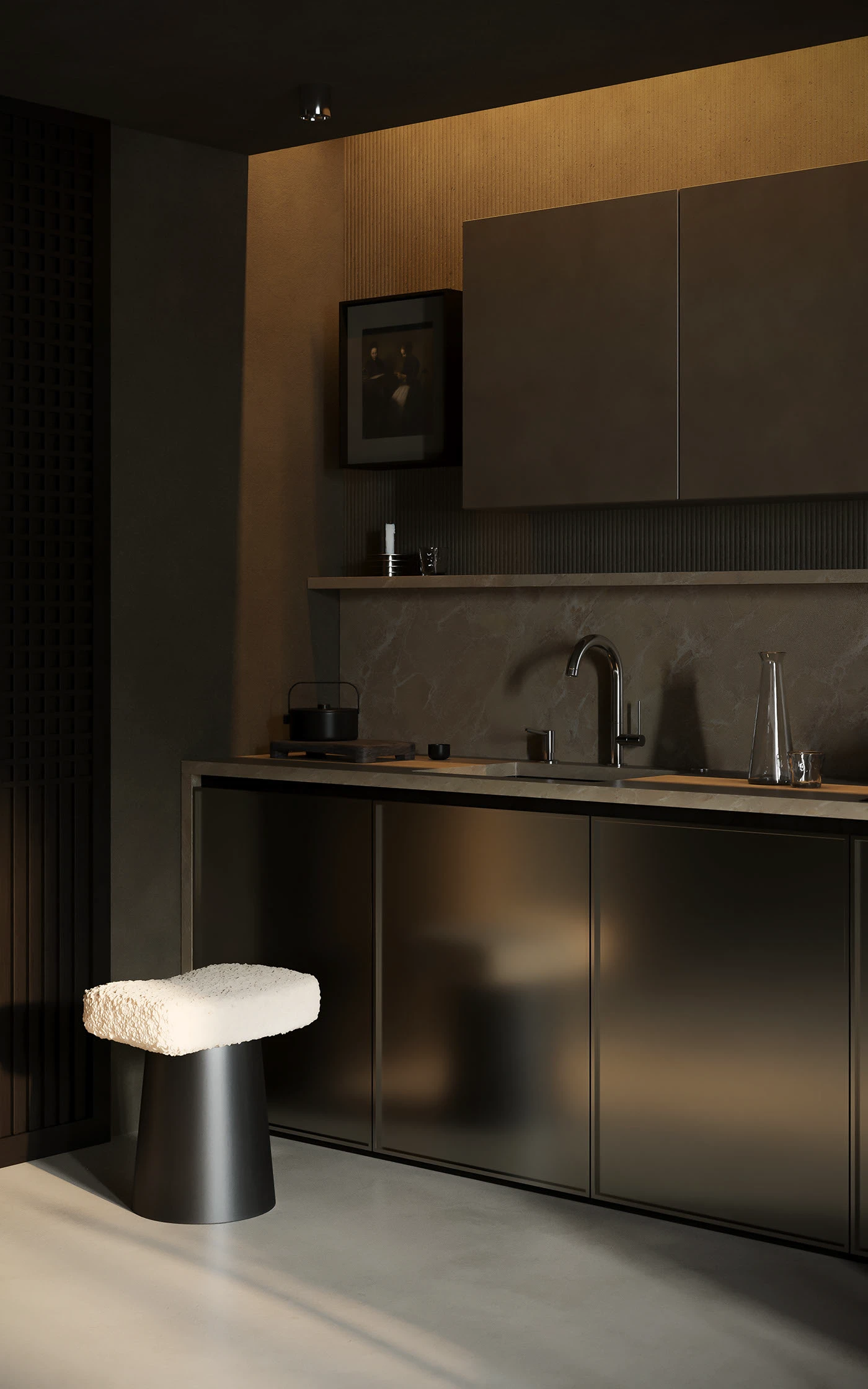 The concept relies on restraint and texture rather than decoration. Light becomes an architectural material: it cuts across ribbed plaster walls, reveals the depth of marble and stainless steel, and softens through linen curtains and velvet textiles. Dark charred wood and poured concrete floors ground the atmosphere, bringing a sense of permanence.
