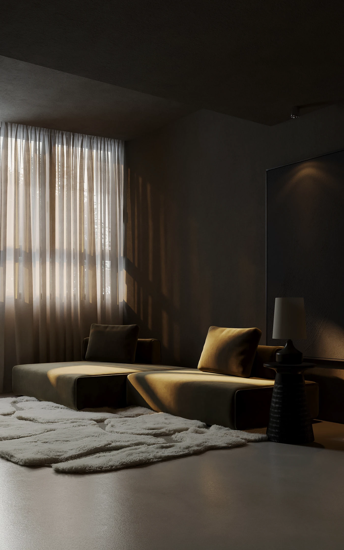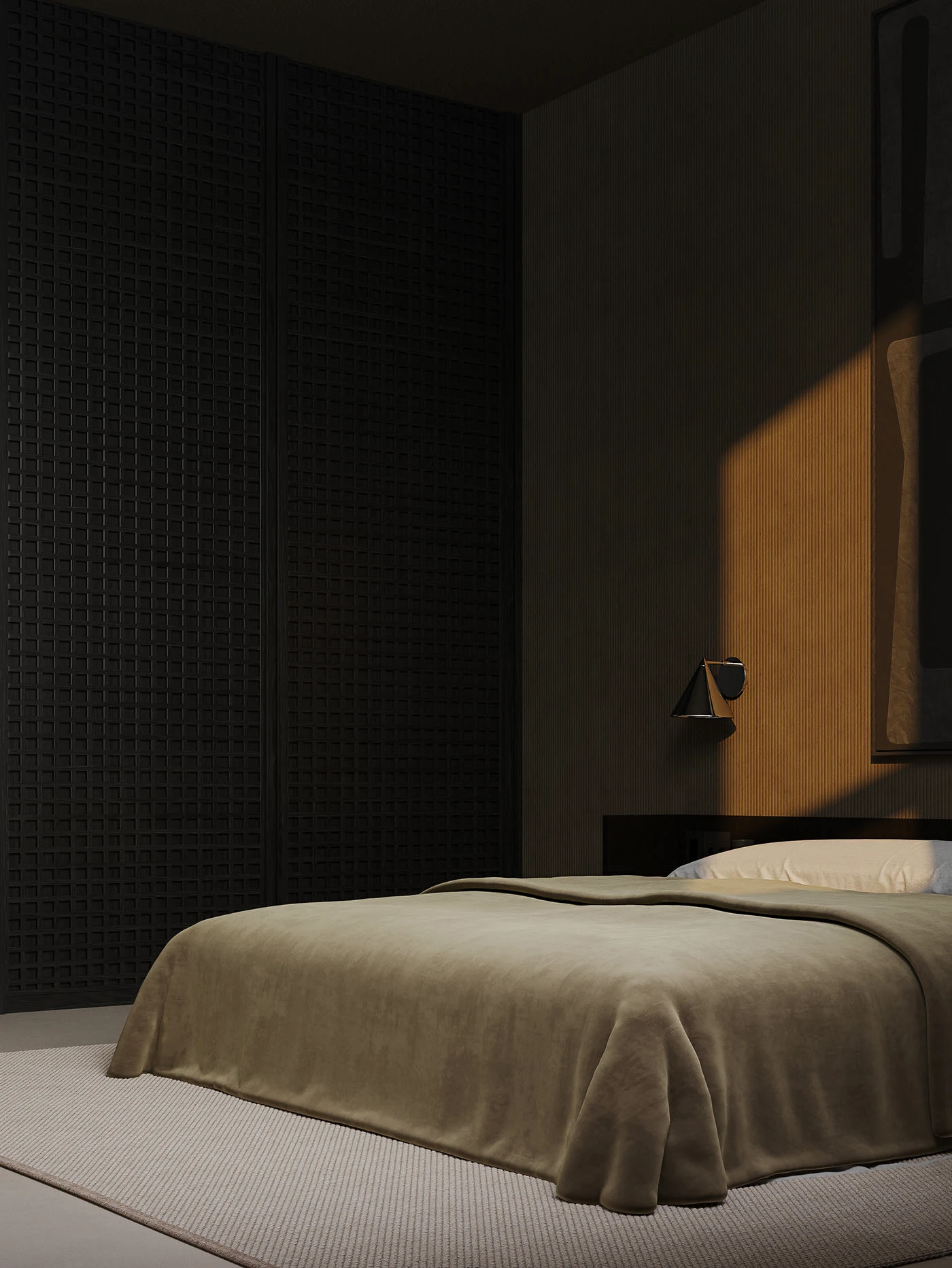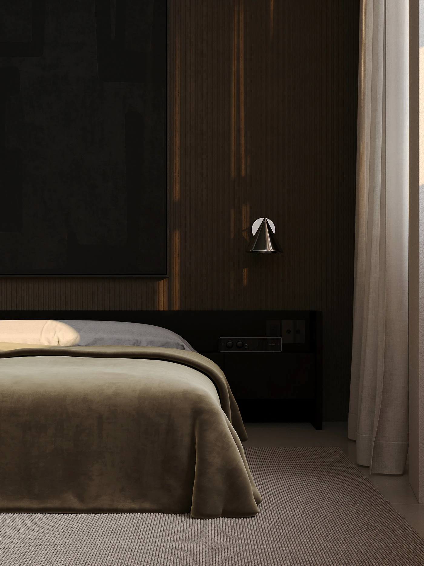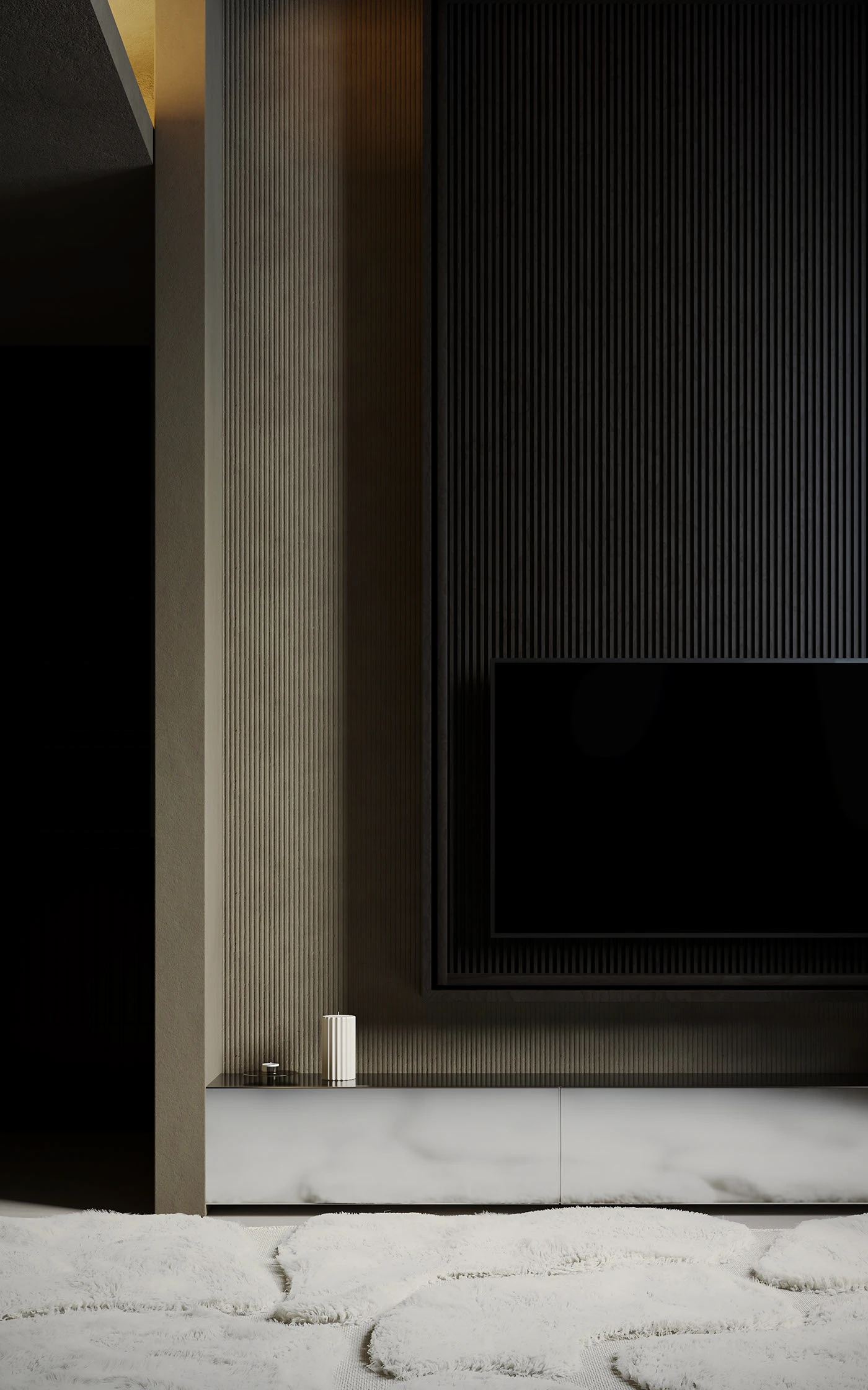 The concept relies on restraint and texture rather than decoration. Light becomes an architectural material: it cuts across ribbed plaster walls, reveals the depth of marble and stainless steel, and softens through linen curtains and velvet textiles. Dark charred wood and poured concrete floors ground the atmosphere, bringing a sense of permanence.