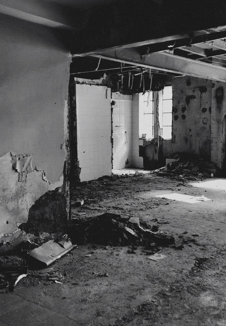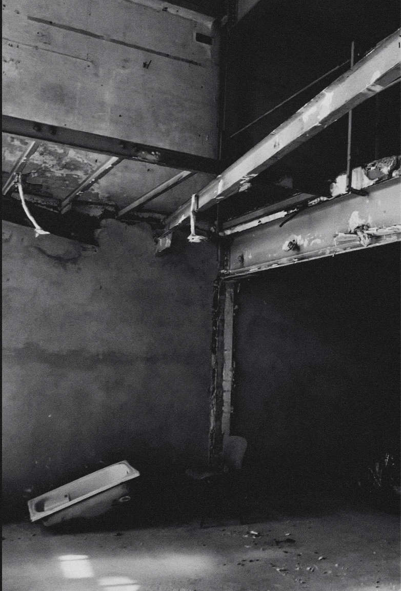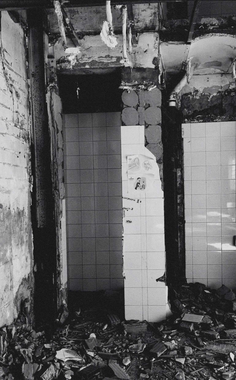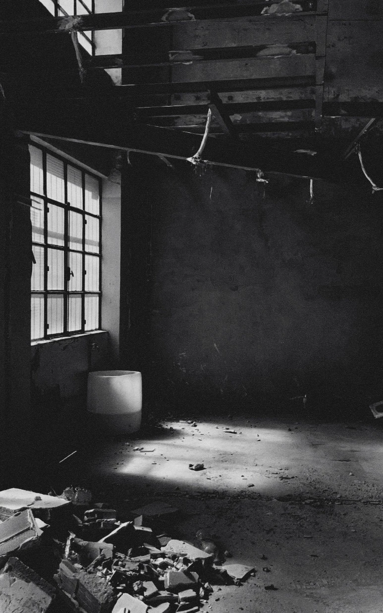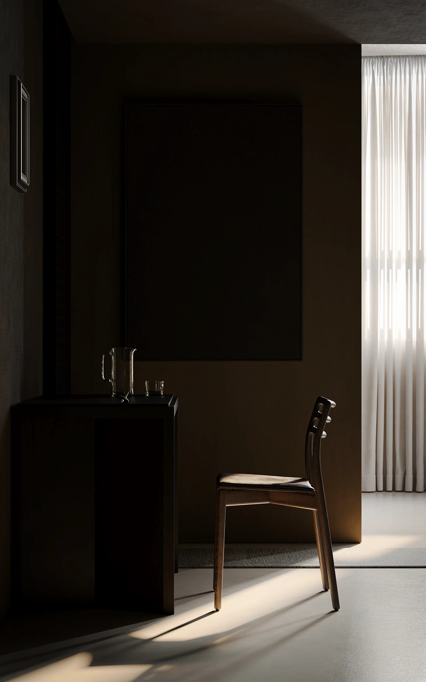 The concept relies on restraint and texture rather than decoration. Light becomes an architectural material: it cuts across ribbed plaster walls, reveals the depth of marble and stainless steel, and softens through linen curtains and velvet textiles. Dark charred wood and poured concrete floors ground the atmosphere, bringing a sense of permanence.
