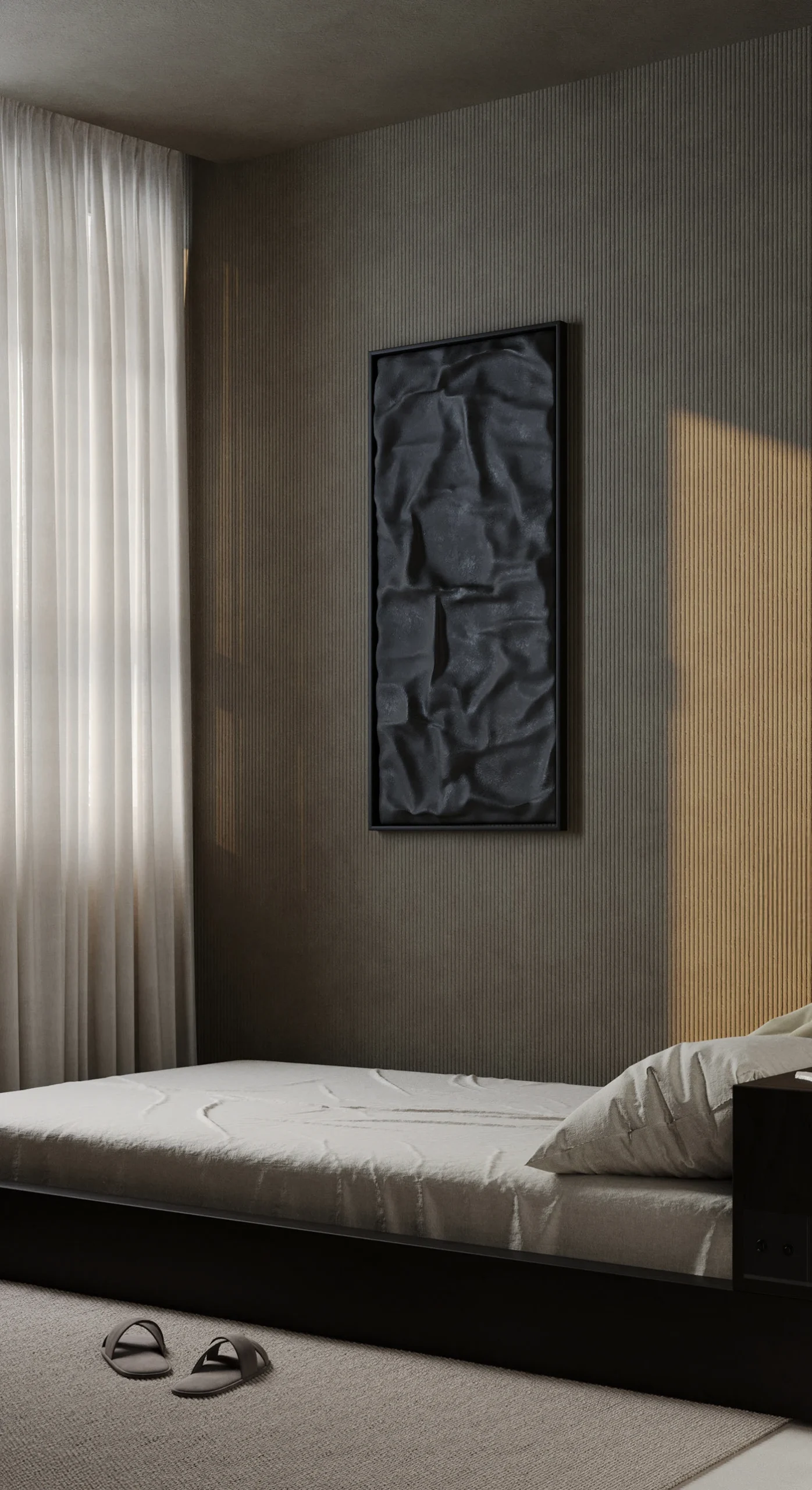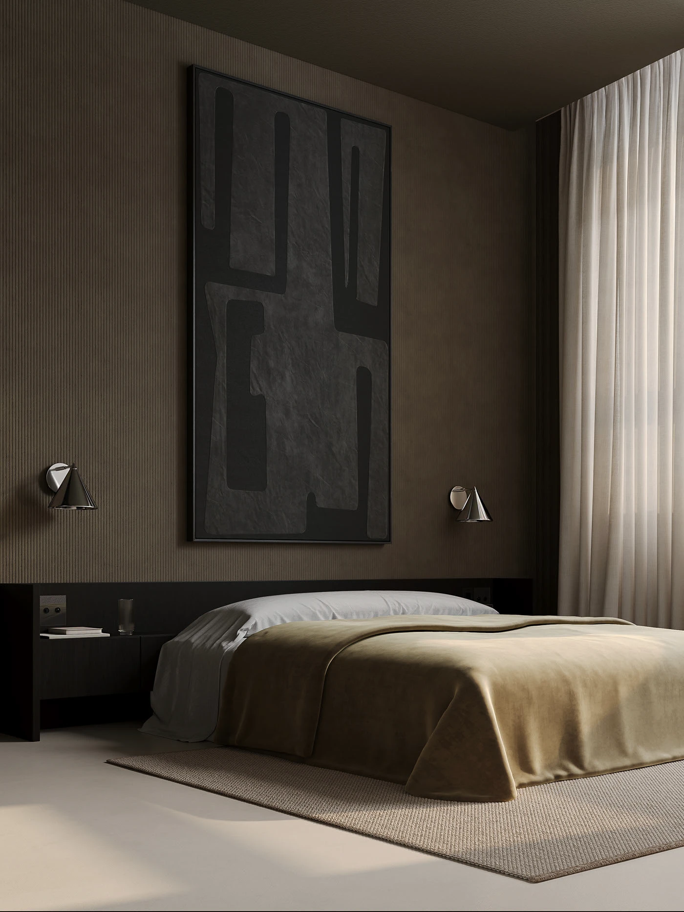 Textured plaster walls and dark charred wood provide a grounding backdrop, while linen curtains filter natural light into a soft glow. Velvet bedding and sculptural wall art add tactile depth, creating a space that feels meditative and private.