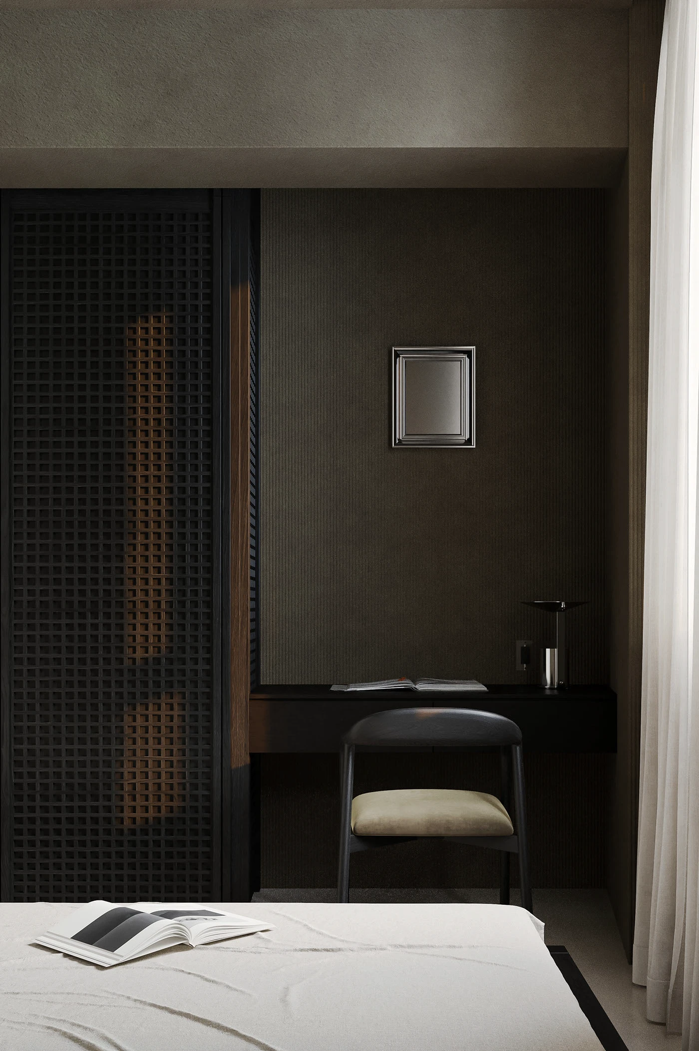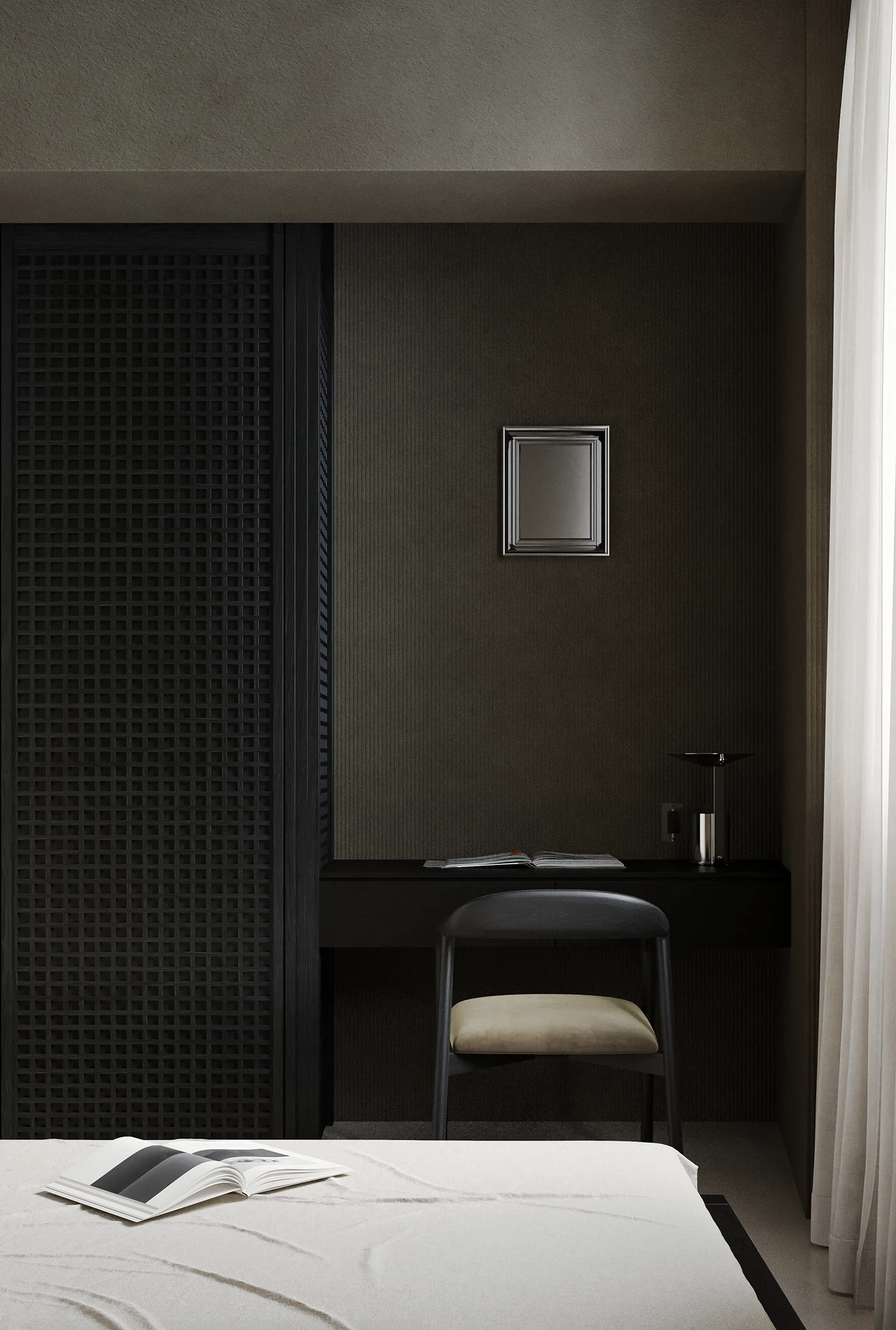 The design avoids excessive décor, focusing instead on material expression and atmosphere. Textured plaster, marble, stainless steel, velvet, linen, and charred dark wood form the basis of the palette. Each element was selected for its tactile quality and visual depth, creating interiors that feel both minimal and rich.