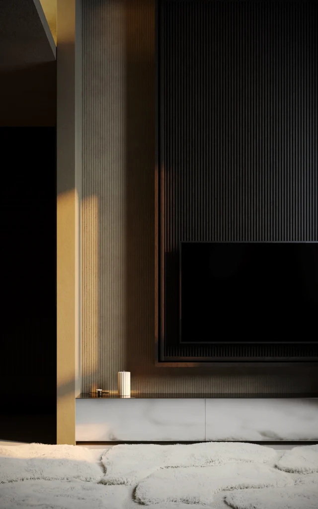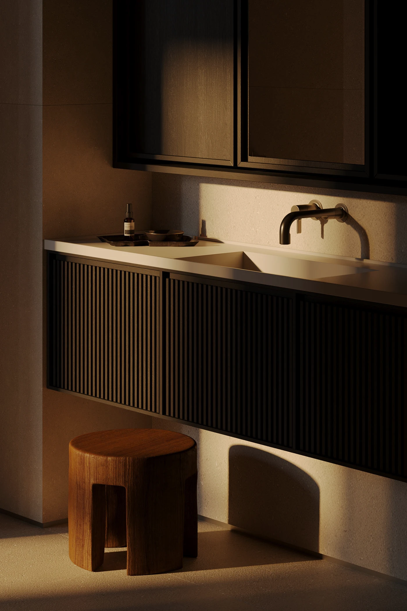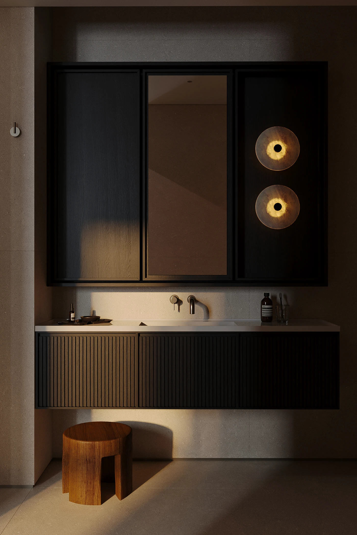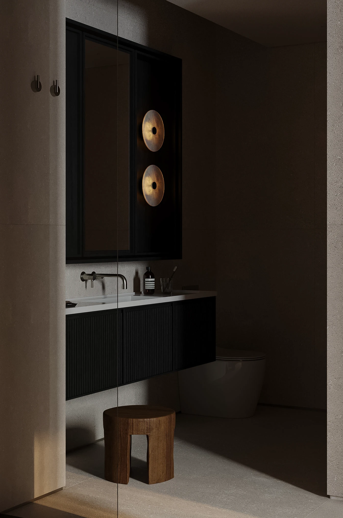 The bathroom explores contrasts between stone and wood. Vertical wooden panels are paired with smooth marble and warm bronze lighting, creating an environment that feels both structured and intimate. The design highlights material honesty, where light interacts with surfaces to enhance their natural qualities.