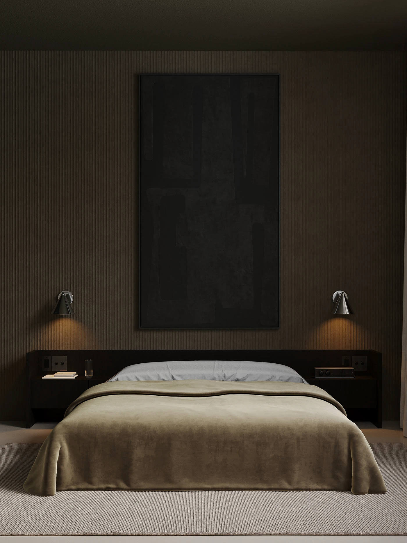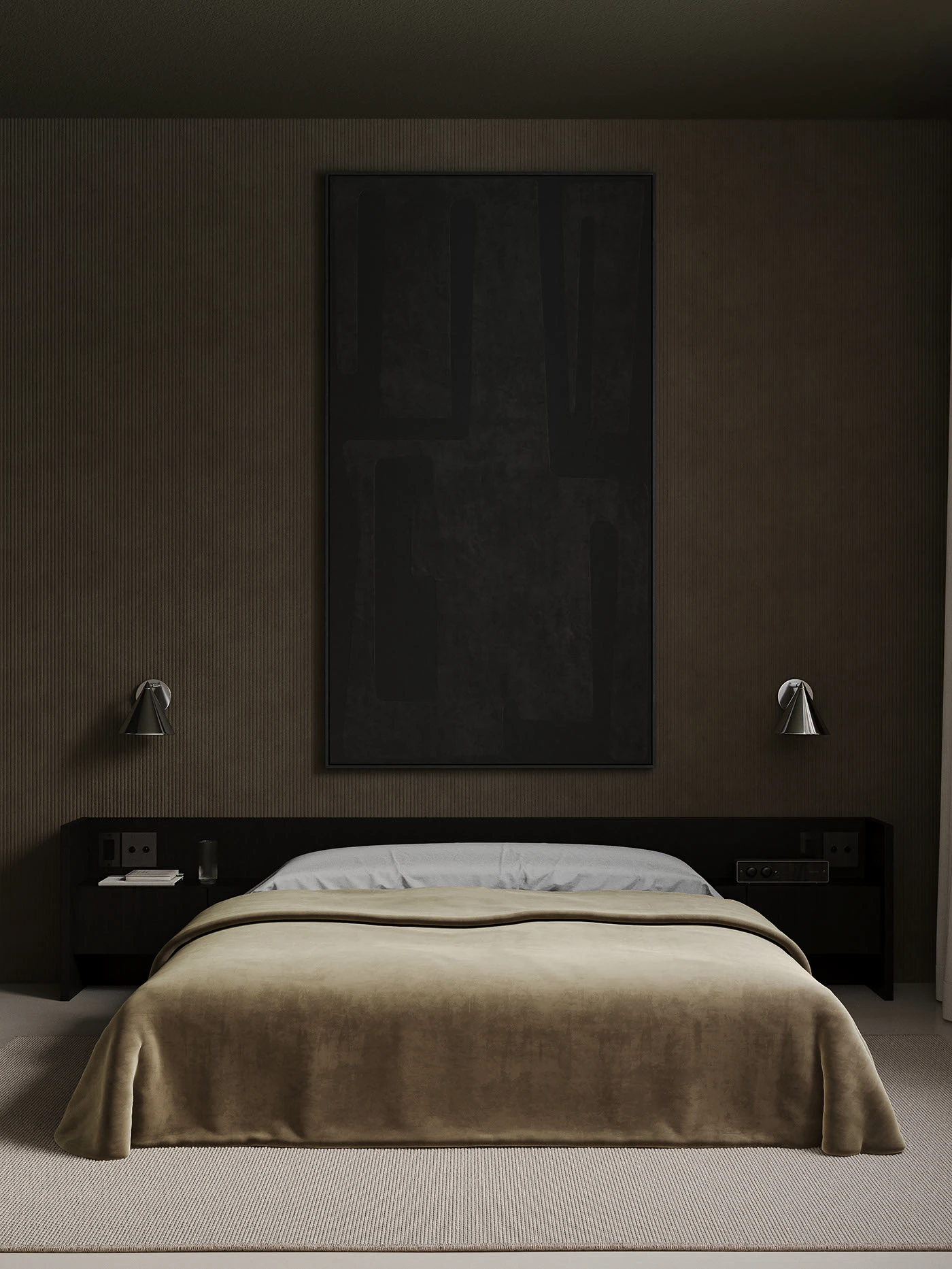 The bedroom is designed as a calm retreat with low proportions and a minimal color palette.