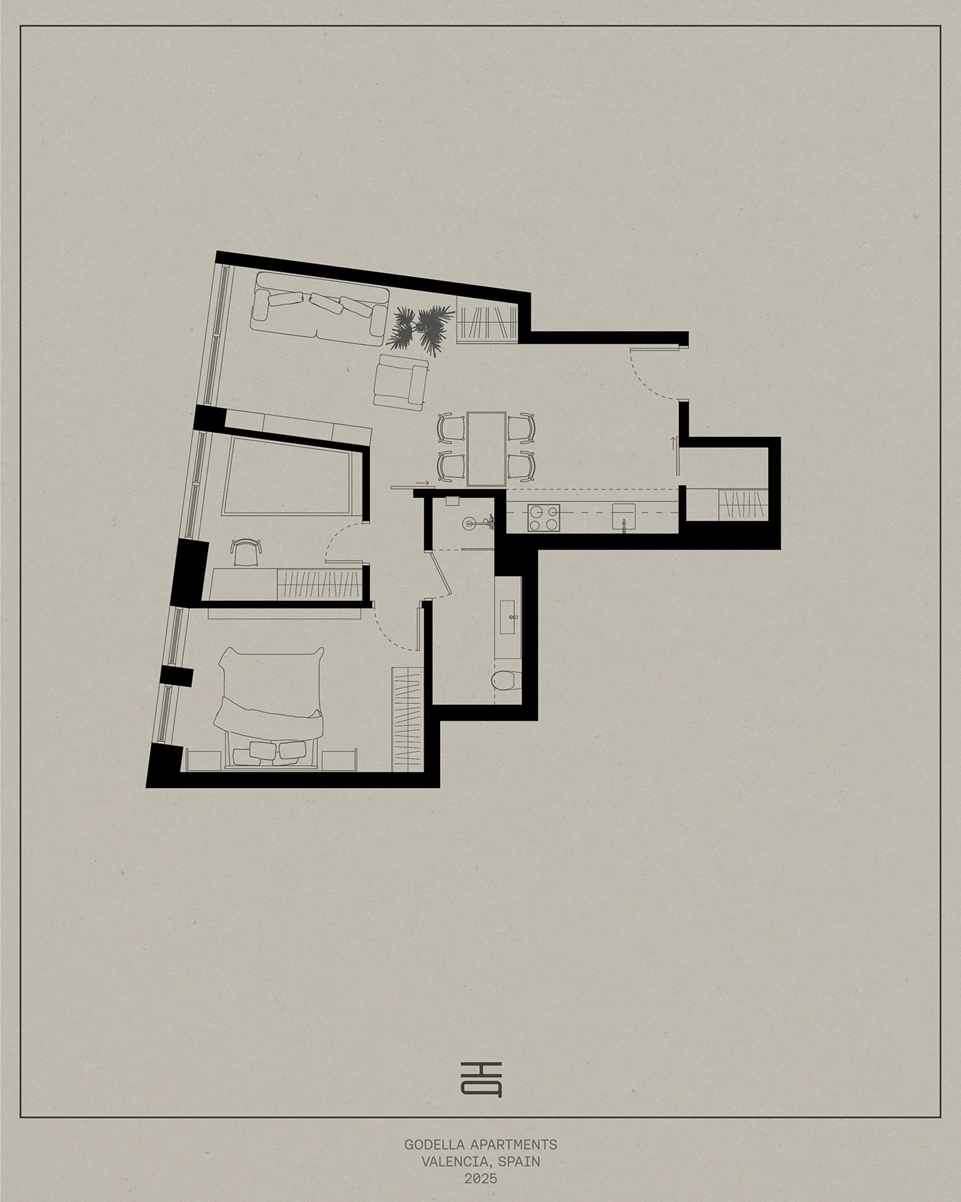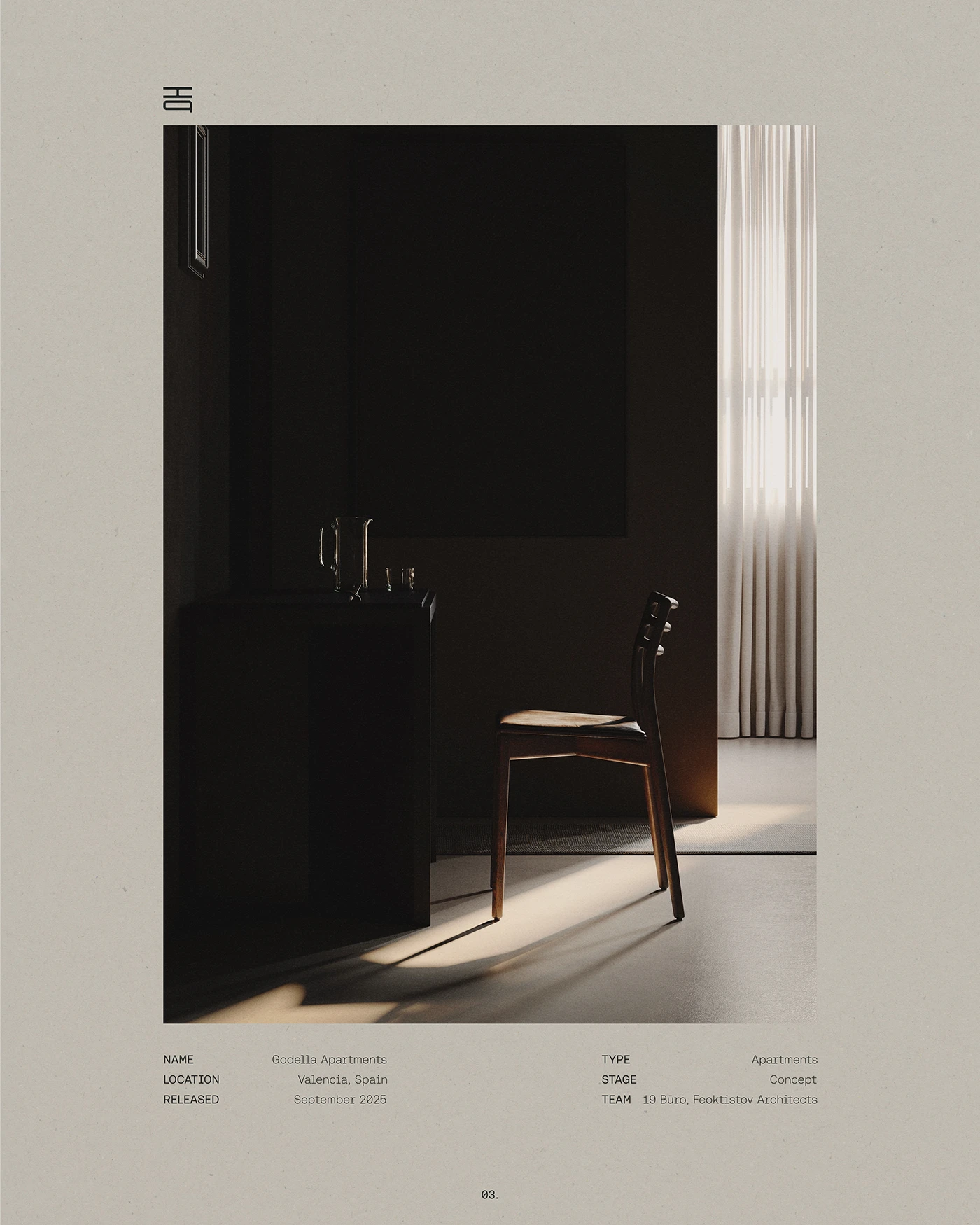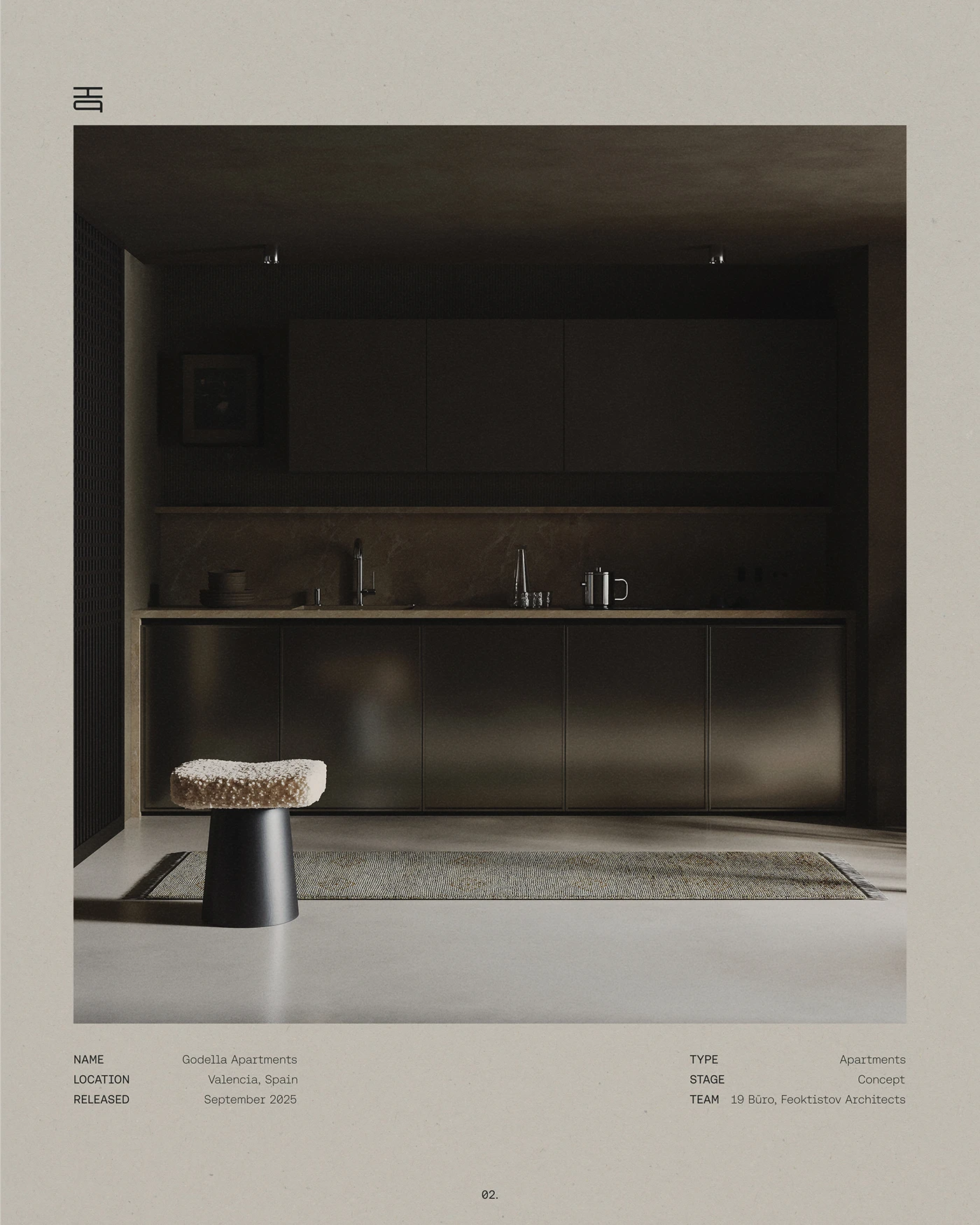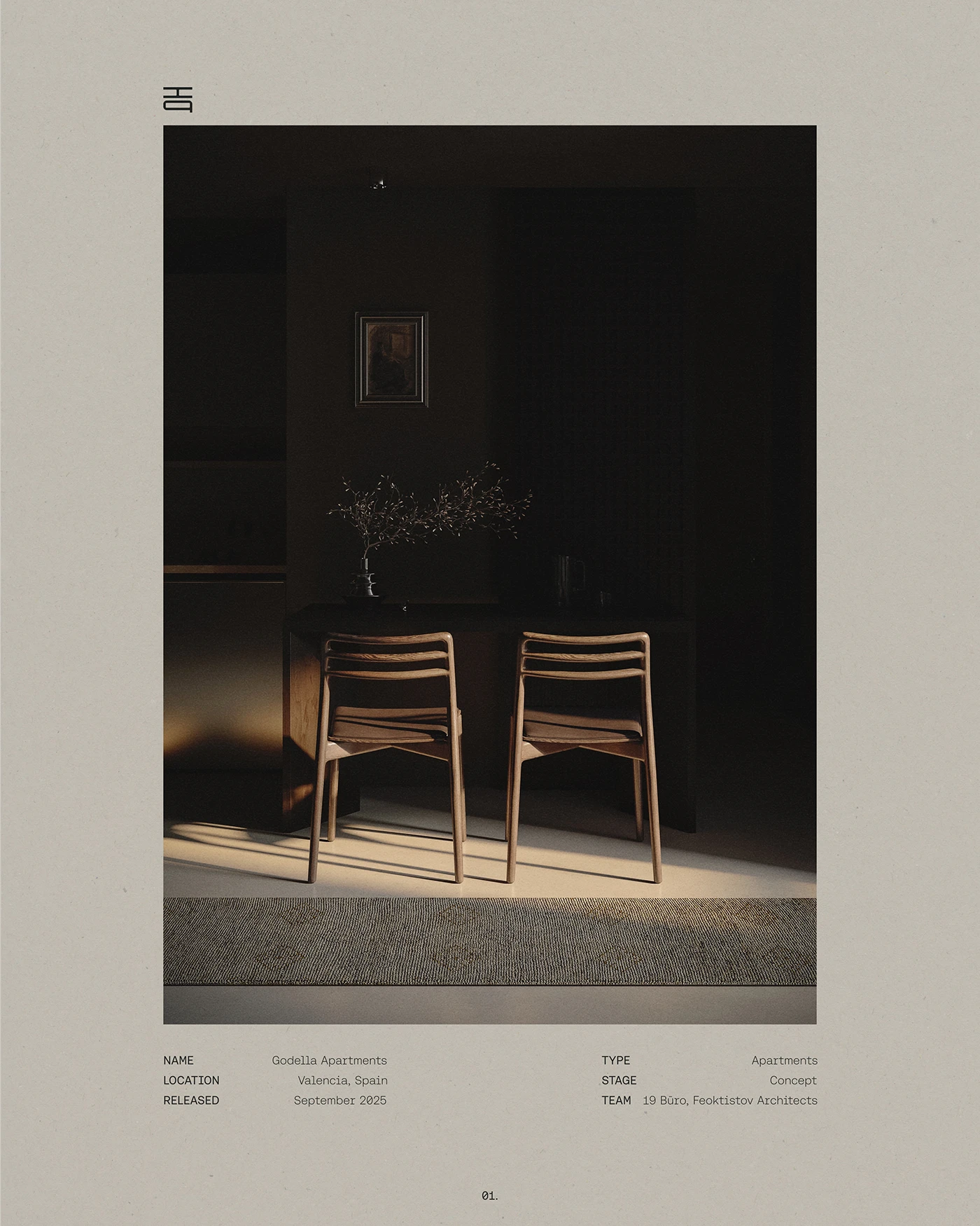 Godella Apartments is a residential interior designed by 19 Būro, located in a former factory building in the center of Valencia. The project translates principles of Japanese minimalism and wabi-sabi into a contemporary European context.