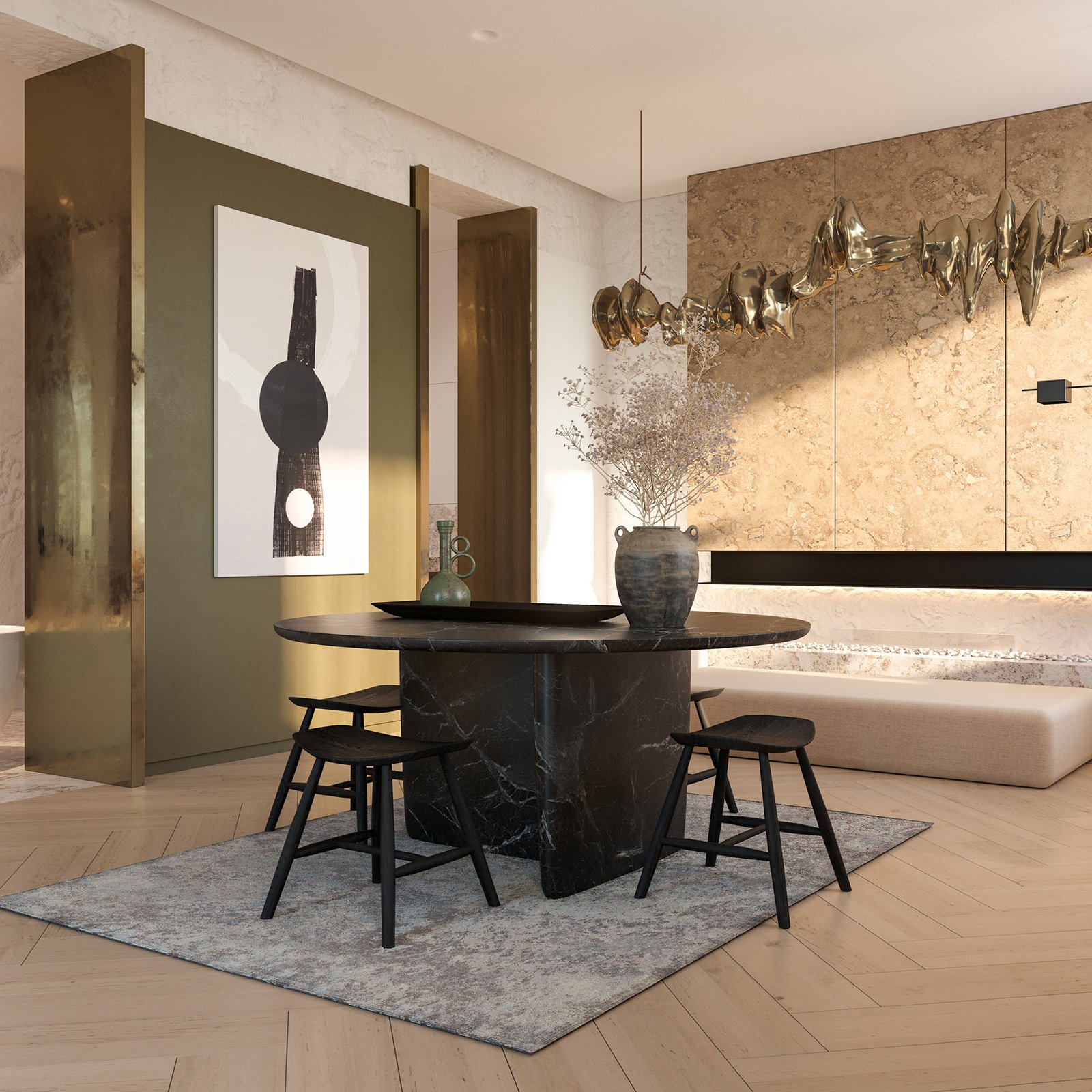 At its core, the concept follows the philosophy of “sculpted minimalism,” where space is treated as a three-dimensional composition rather than a flat arrangement. Walls, ceilings, and furniture are designed to feel interconnected, forming a cohesive sculptural environment. Voids and volumes are used intentionally, allowing light and shadow to shape the perception of space and enhance the overall experience.
