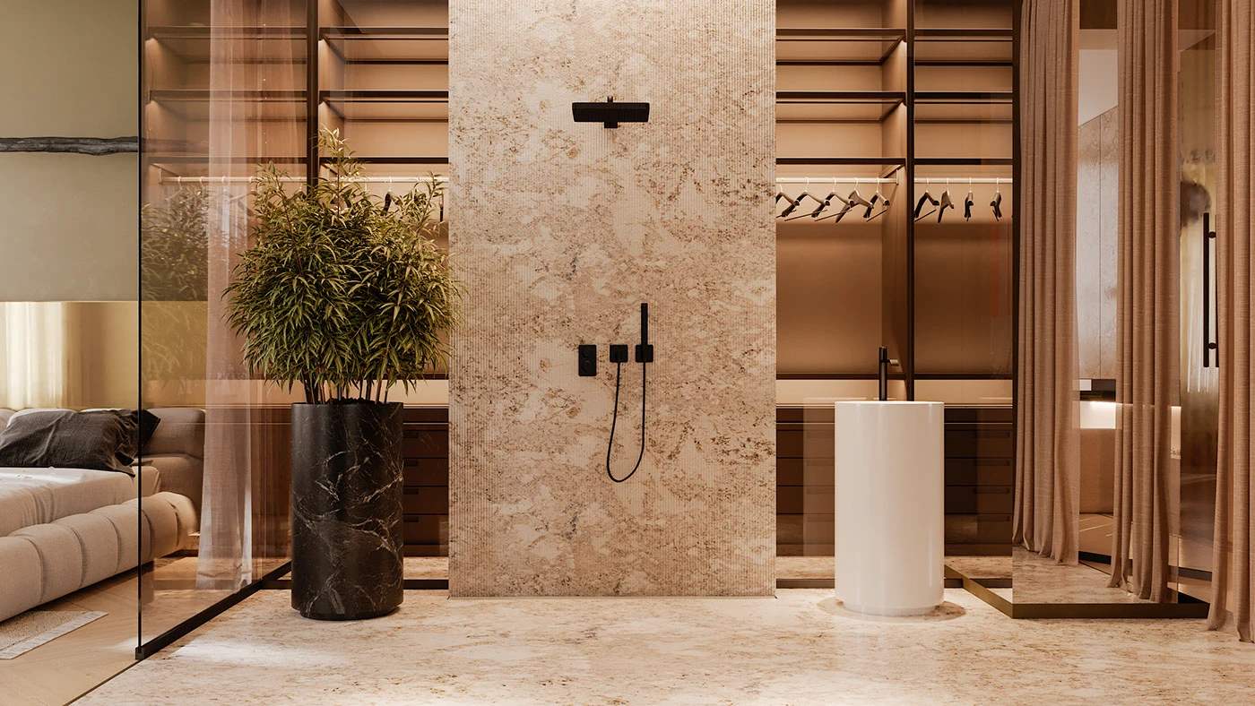 Rather than relying on decorative complexity, the design is defined by architectural clarity and the richness of materials. Clean lines, controlled geometry, and carefully selected finishes create a sense of calm and balance throughout the space. The interiors are not overloaded with elements; instead, they focus on creating visual depth and atmosphere through subtle contrasts and refined detailing.