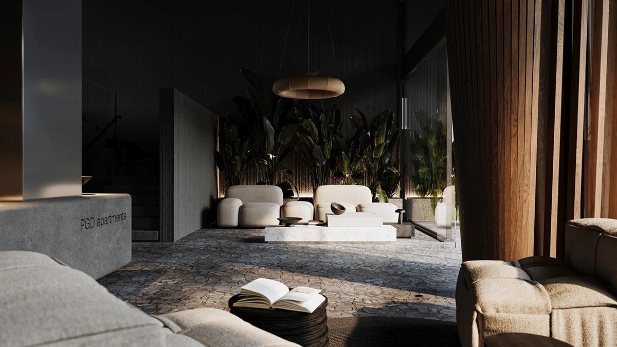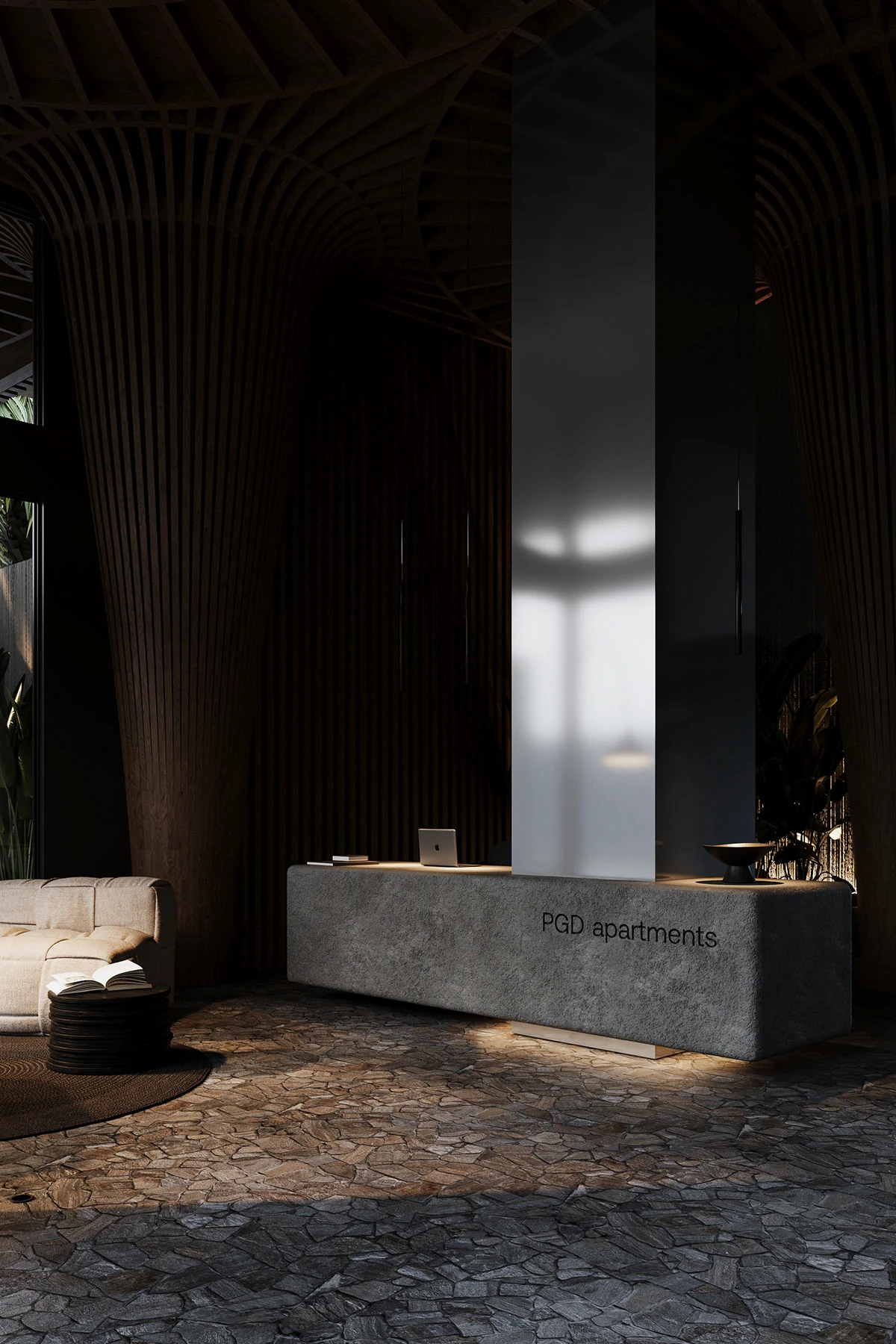 The entrance hall of PGD Aparthotel is more than just a transitional space; it serves as a defining architectural statement that sets the tone for the entire project. Designed in 2024 by SHOVK in collaboration with 19 Būro, and located in Bali, Indonesia, the aparthotel spans approximately 8000 square meters. From the very first moment of entry, the space establishes a strong identity, introducing visitors to a refined environment where design, atmosphere, and experience come together seamlessly.