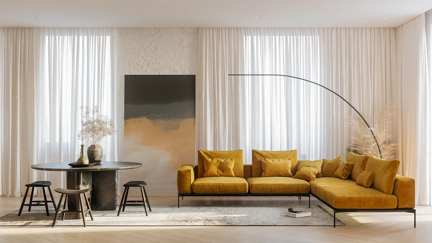 Stone carries weight and permanence. Wood introduces warmth and tactility. Linen softens edges, creating a sense of comfort. Together, these materials form a composition that is both restrained and expressive.
